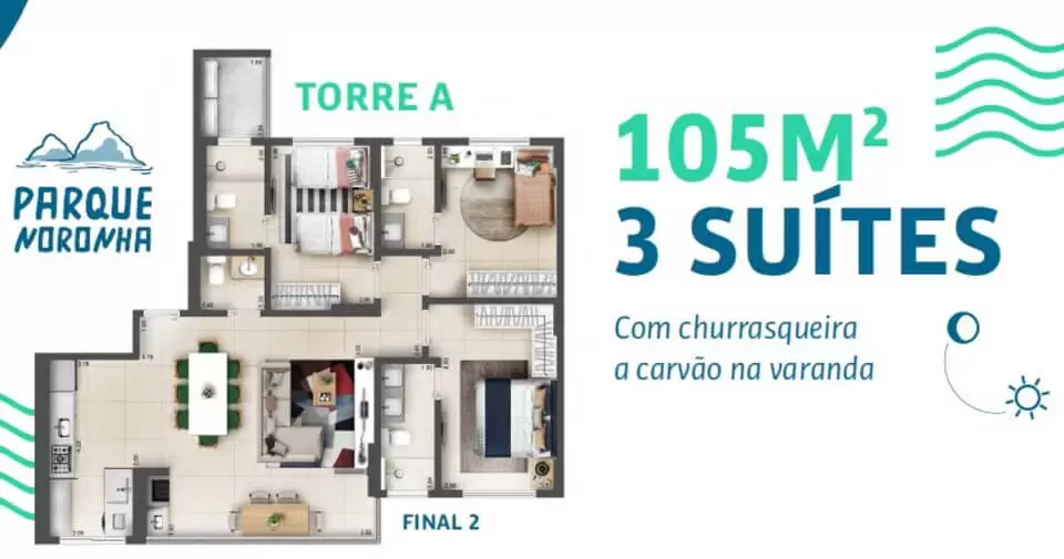 Os apartamentos disponíveis no Parque Noronha possuem 105 m² e 121 m², oferecendo todo o espaço e sofisticação que você procura.