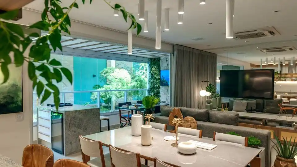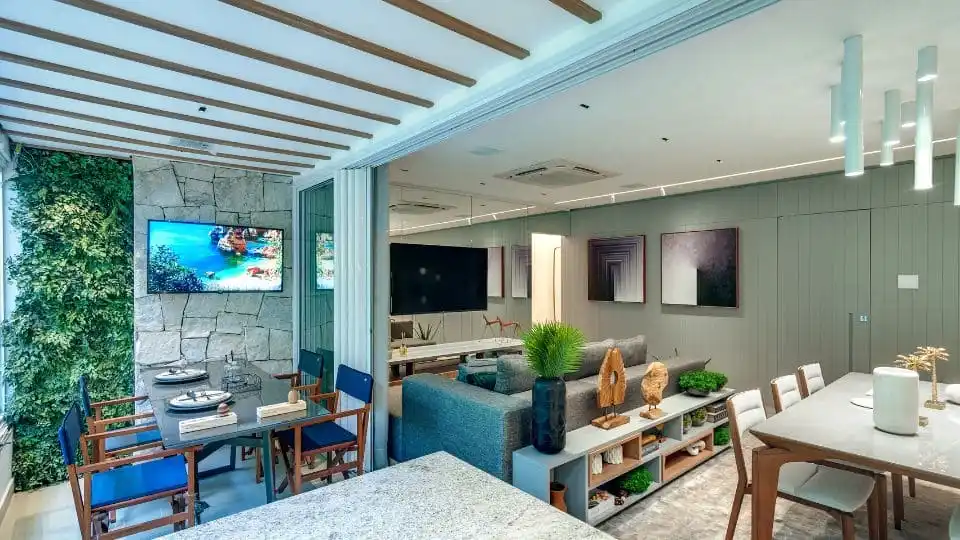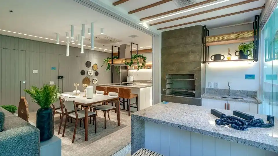 - Espaços de convivência: boulevard, espaço gourmet, salão de festas adulto e infantil, churrasqueira, varanda de jogos e poker/snooker bar
