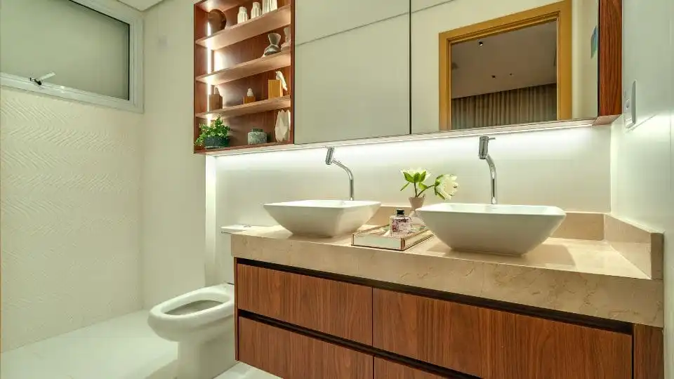 - Acabamento premium: porcelanato acetinado retificado 90×90 em todos os ambientes;
