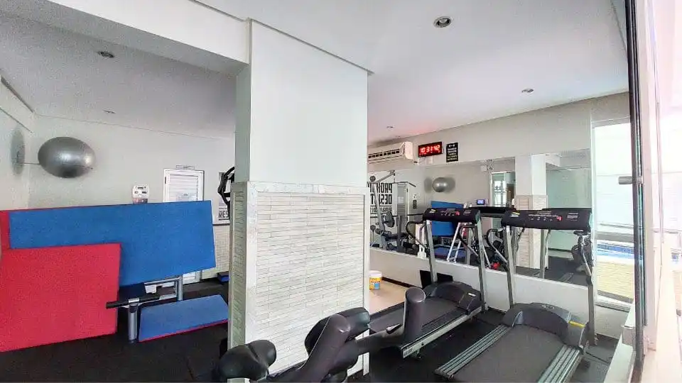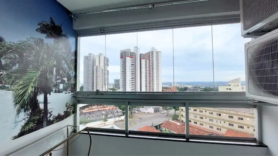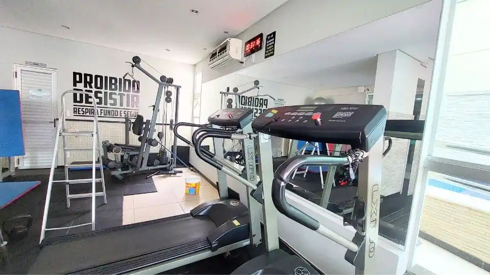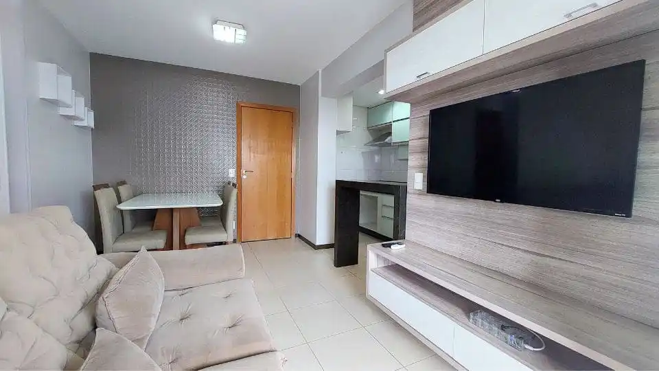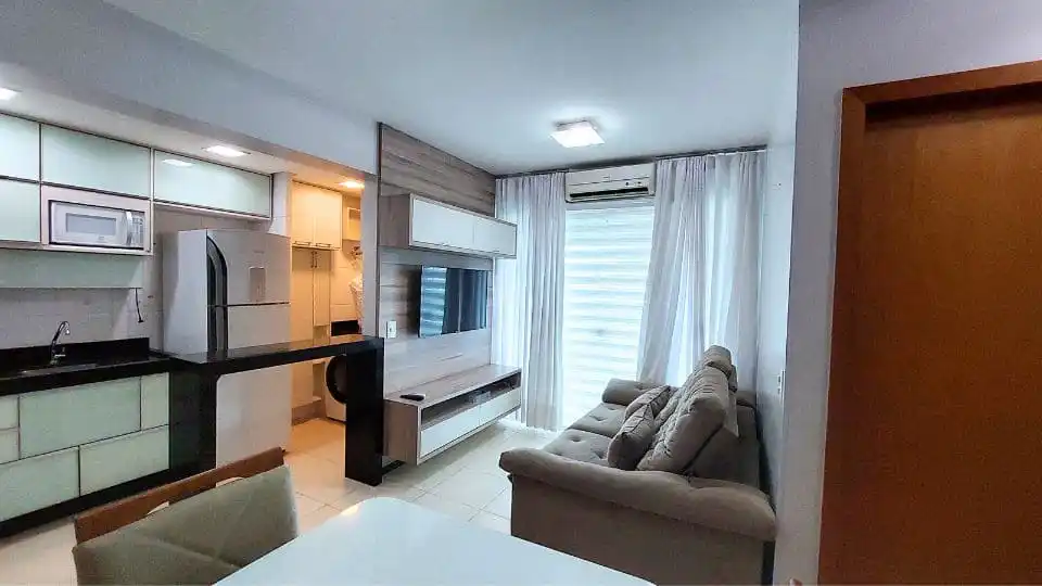 Sala 2 ambientes, mesa com 4 cadeiras, sofá, painel para tv com rack, TV 43″, ar condicionado,  cortina,  piso porcelanato;