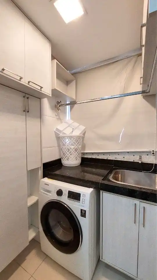 Área de serviço com tanque inox, máquina de lavar roupas Samsung Digital Inverter, com armários e varal;