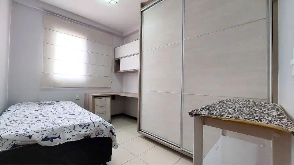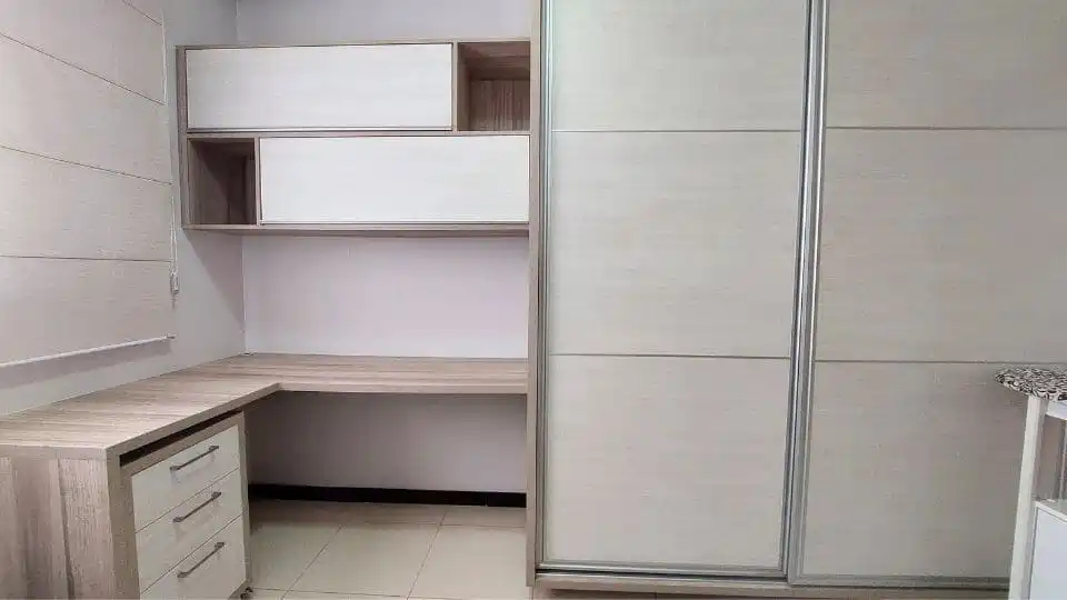 Quarto com cama de solteiro, armário de 2 portas, mesa com gavetas e armários, cortina, tábua para passar roupa com armário.;