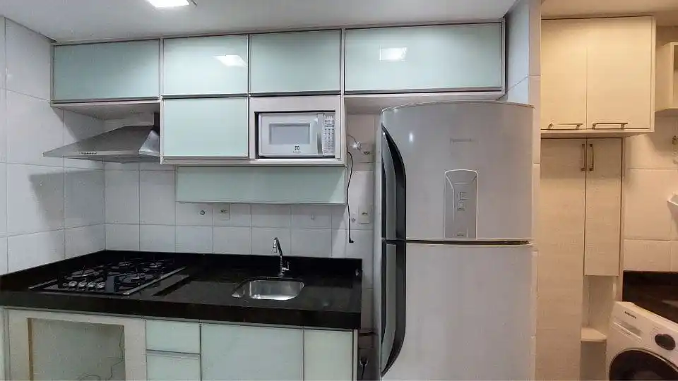 Cozinha completa em armários, Geladeira, fogão, coifa, forno micro-ondas,  forno elétrico, bancada, interfone com tela;