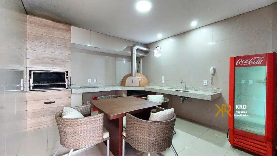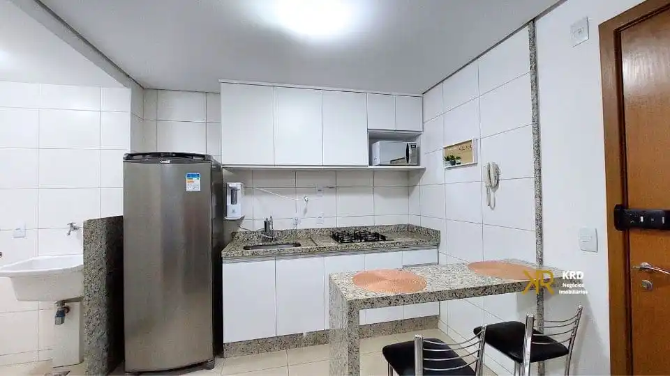 - Cozinha equipada com armários, geladeira, fogão, forno micro-ondas, bebedouro e bancada com 2 banquetas
