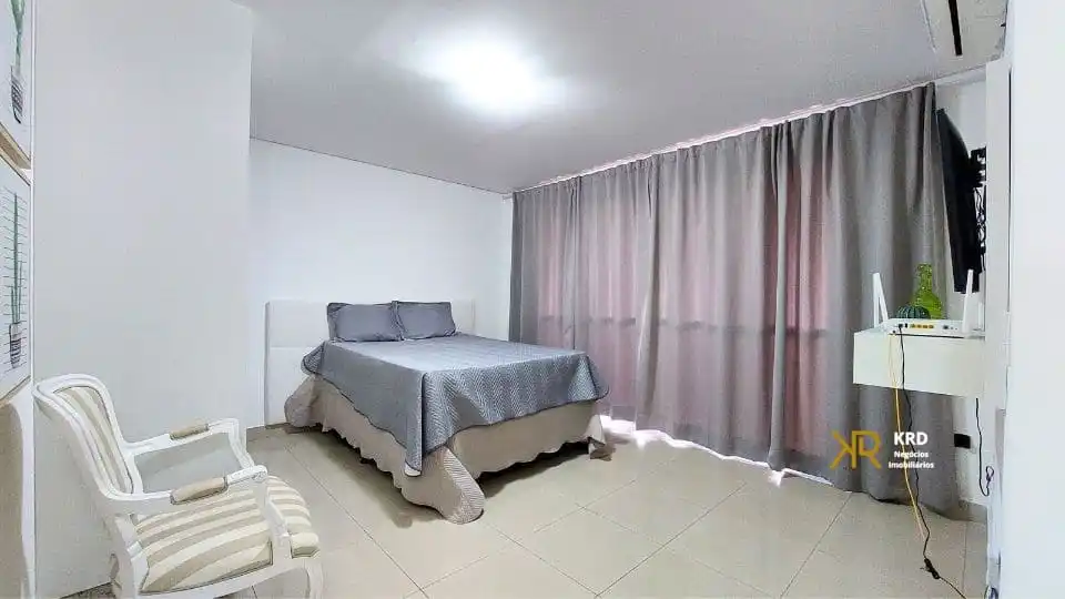 - Quarto completo com cama de casal, colchão, rack, TV e cortina