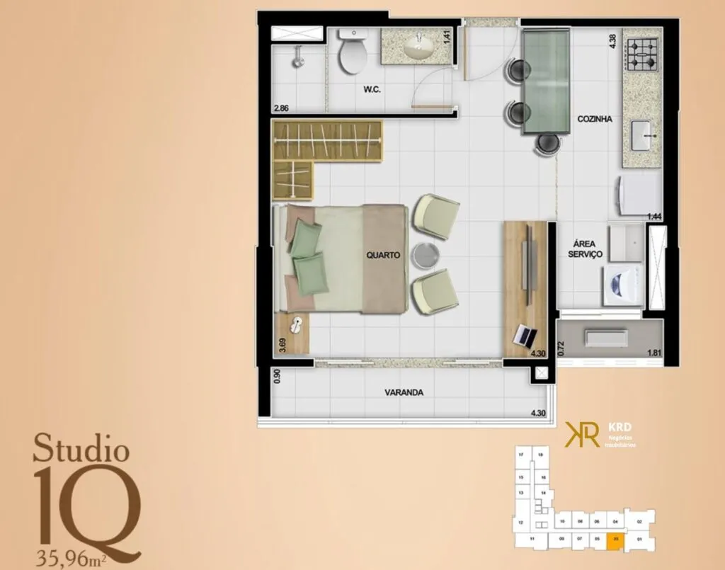 Com 35,96 m² de área privativa, este apartamento tipo studio foi projetado para quem valoriza design funcional e integração de ambientes.